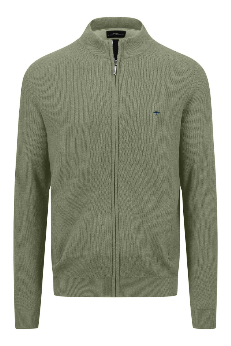 Laadukas pitkähihainen neuletakki, jossa vetoketjukiinnitys ja käytännölliset etutaskut.